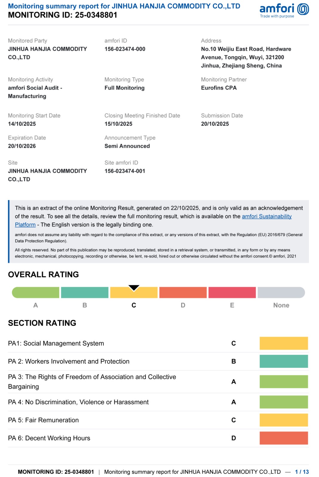 Jinhua Hanjia Commodity Co.,Ltd. passed its BSCI audit this year on October 14th, receiving Grade C certification, the minimum required by the client. This certification is valid for one year. The BSCI audit was conducted by EUROFINS, the client's designated organization. The client regularly purchases stainless steel products from our company, including wine openers, barware, and cocktail shakers.